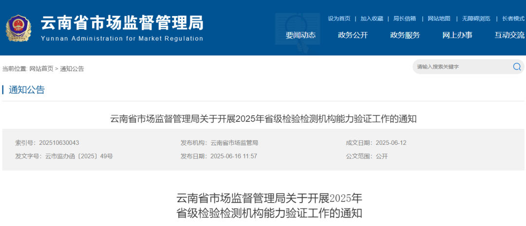 近日,云南省市场监管局发出通知,决定在社会重点关注的部分检验检测领域组织开展2025年省级检验检测机构能力验证工作,本次能力验证项目共7项,取得云南省市场监管局和州、市市场监管局颁发的资质认定(CMA)证书中包含相关项目(参数)检验检测能力的检验检测机构(授权签字人)应当参加本次能力验证,机构须在2025年7月10日前进行报名。