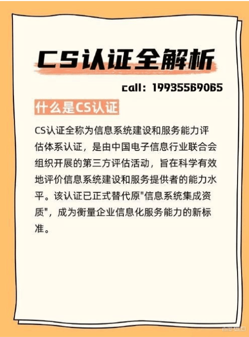 CS认证是由中国电子工业标准化技术协会信息技术服务分会(ITSS分会)组织实施的评估活动。它旨在规范信息技术服务市场,提升企业服务能力,并帮助客户识别和选择优质的服务提供商。